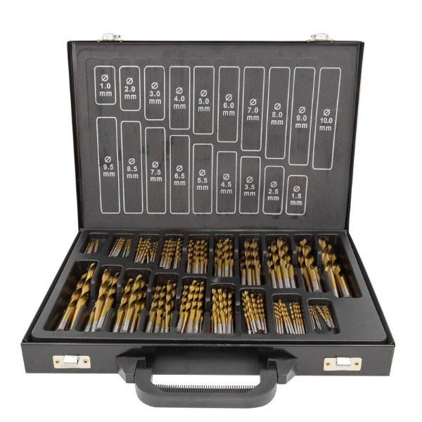 Набір Rockforce RF-924U170 включає 170 свердлів по металу, діаметром 1-10 мм, упакованих в металевий кейс. Кут заточування свердлів становить 118 °, тому вони оптимальні для обробки чорних металів, сталі, чавуну та твердої бронзи. Набір нагоді в побуті і на будівельному майданчику. Переваги Міцність і високий ресурс - оснастка виконана з швидкорізальної сталі. Висока якість виконання завдяки процедурі поетапного шліфування набір повністю відповідають заявленим розмірам. Підвищена продуктивність - поверхня свердел відполірована, що знижує тертя і забезпечує ефективне відведення шламу. Сумісність з усіма типами набоїв - свердла мають універсальні циліндричні хвостовики. Швидкий пошук потрібного оснащення - на кришці кейсу є маркування з позначенням типорозміру оснастки. Комфортна робота — робоча частина свердел звужується до хвостовика, тому їх не заклинює в процесі експлуатації. Зручне зберігання та транспортування – набір поставляється у металевому кейсі з ручкою. Комплектація Свердло по металу 1мм-10 шт Свердло по металу 1,5мм-10 шт Свердло по металу 2мм-10 шт Свердло по металу 2,5мм-10 шт Свердло по металу 3мм-10 шт Свердло по металу 3,5мм-10 шт Свердло по металу 4мм-10 шт Свердло по металу 4,5мм-10 шт Свердло по металу 5 мм-10 шт Свердло для металу 5,5 мм 10 шт Свердло по металу 6 мм-10 шт Свердло по металу 6,5 мм-10 шт. Свердло по металу 7 мм-10 шт Свердло по металу 7 мм-10 шт Свердло по металу 7,5 мм-10 шт. Свердло по металу 9,5мм-5 шт Свердло по металу 10мм-5 шт Металевий кейс 1 шт